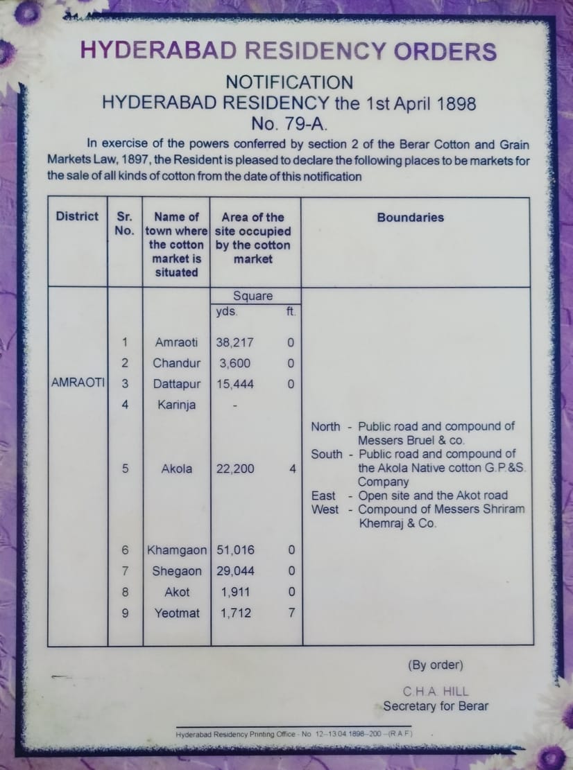 एकोणिसाव्या शतकाच्या शेवटी इंग्रजांनी स्थानिक स्वराज्य संस्थांची भारतीयांना व्यवस्था दिली व त्याअधीन शेतकऱ्यांनी विकलेल्या शेतमालाला नियंत्रित केन्द्रीत बाजार व्यवस्था निर्माण करण्याचे दृष्टीने कॉटन मार्केट कमिटीची स्थापना १८८६ साली झाली व १८९७ साली कॉटन रेग्युलेशन ॲक्ट लागू झाला. १ एप्रिल १८९८ च्या हैदराबाद रेसिडन्सी ऑर्डर नं.७९-१ चे नोटिफिकेशननुसार अमरावती विभागातील ९ ठिकाणी कॉटन मार्केटचे नोटिफिकेशन प्रसिद्ध झाले.